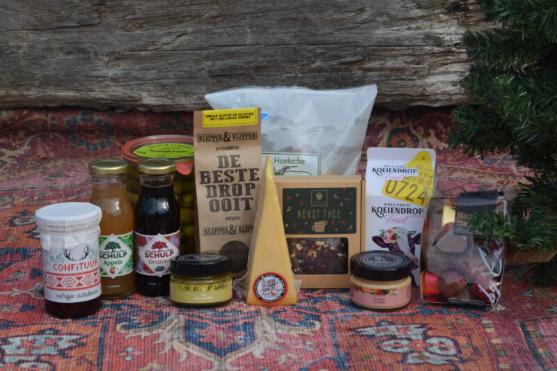 Inhoud: melkpak, koeiensnoepjes, chips, drop, augurken, sapjes, kaasdip, chipsdip, oude gracht kaas, kerst chocolade, kerstthee, aardbeien jam